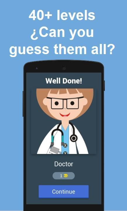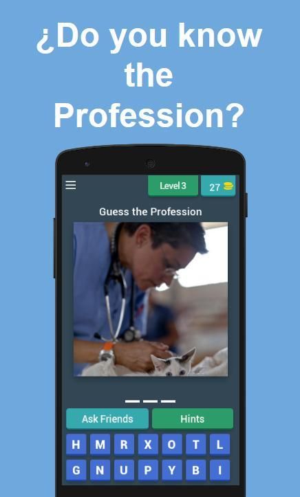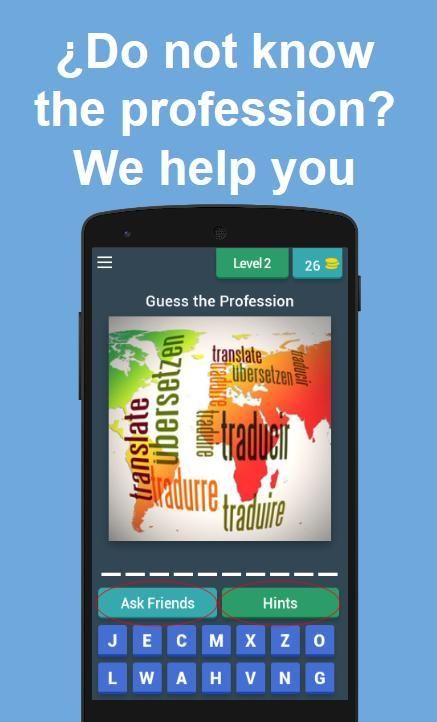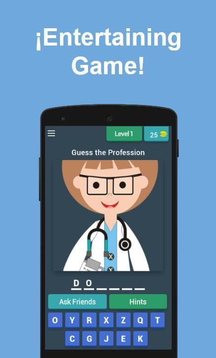 You have to guess and correctly write the name of the profession by selecting the letters available, if you make a mistake you can remove the incorrect letters by simply touching them. If you cannot guess you can ask a friend which profession you do not know or use the accumulated coins of the profesisons already resolved to obtain hints.
