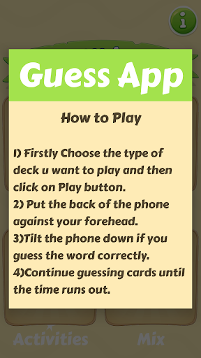 1. Put the back of the phone against your forehead. 2.Tilt the phone down if you guess the word correctly. 3.Continue guessing cards until the time runs out.