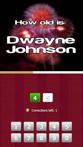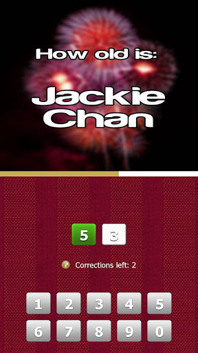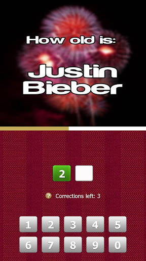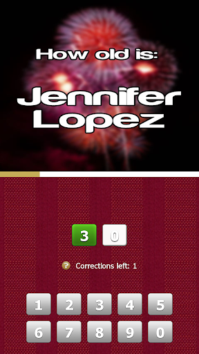 Each new game consist of 10 celebrities. Guess the correct age within the time limit. Input the age by pressing in the numbers. In each picture you have 3 changes to make corrections. Make a correction by pressing on the wrong number.