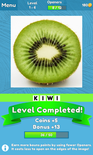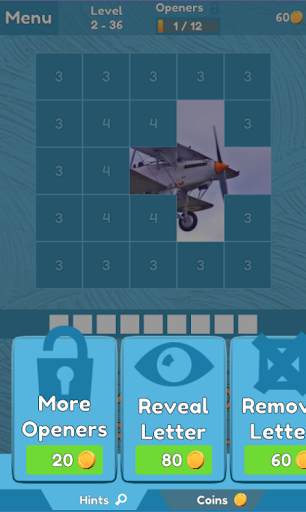 Use hints to help solve difficult levels, such as revealing more of the hidden image, lock in a correct letter, remove an unneeded letter or even skip the entire level!