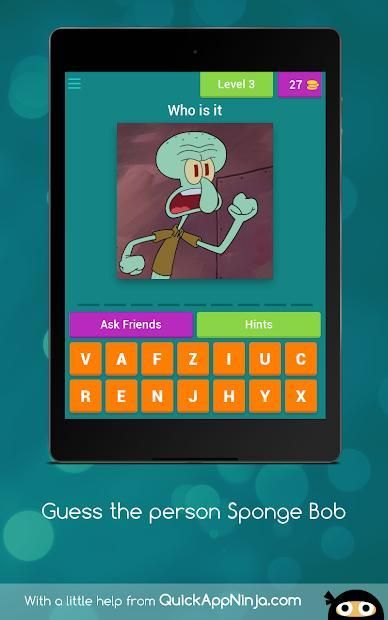 It the best game about Spongebob Squarepants!!! In this game you have to guess all the characters of the cartoon Spongebob Squarepants. Spongebob Squarepants will please you if you go through the game to the end. SpongeBob is waiting for you to download this application! Have a good game!