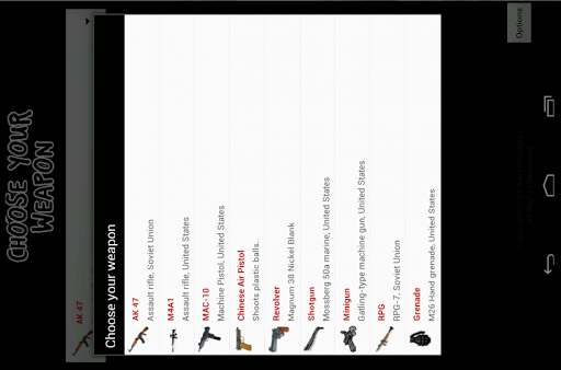 The game has nice Animations, information for each Weapon, 11 Weapons including RPG and Grenade! It is the only Game with Vibrations when shooting and Options to enable or disable Music.