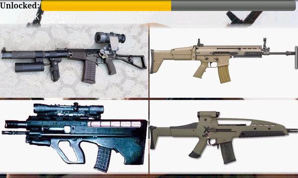 Guns inside: AICW, AK-47, AK-74u, AS Val, AWM, Benelli M4, Beretta M9, Vektor CR-21, CZ 805 BREN, Desert Eagle, Dragunov_SVD_1, FAMAS, FGM-148 Javelin, FN F2000, FN P90, FN Scar, H&K G3, H&K G36, Galil-MAR, Glock, Luger P08 Parabellum, M16 Rifle, M18A1 Claymore, M1911 .45, M249 LMG, M4 Carbine, M40 Rifle, M67 Frag, M72 LAW, M83 Smoke, M84 Stun, MP40, MP5, OC-14, SIG P228, RPD, SA80 Rifle, SIG SG 550, Škorpion vz. 61, SR-3 Vikhr, Sten, Steyr AUG, StG 44, IMI TAR-21, H&K UMP, H&K USP, UZI, Vepr, Winchester 1200, XM-29 OICW, XM8,