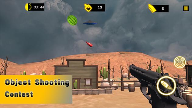Object shooting contest. bottles, watermelons, UFOs appear in the virtual scene, choose your favourite gun, aim at target shoot, practice your shoot skills. Compete with your friends and see who has hit a lot and scores higher within a certain number of bullets. Who is the real shooter?