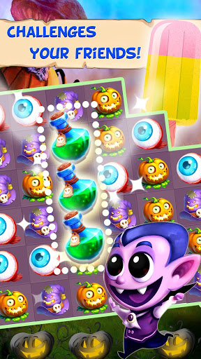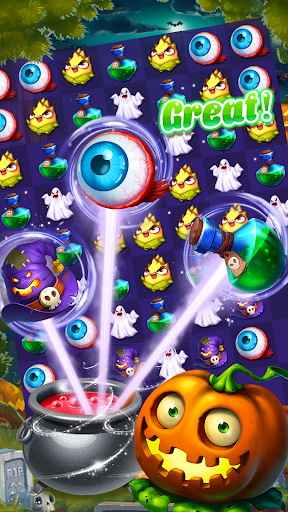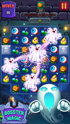 Play strategically with lesser moves and time to collect a number of magical pumpkins and unlock the mystic powers like gas pot, magic skull, power broom, and monster hand to complete the challenging levels. Spin Wheel and lucky to get the powers and candies to use in the game play.