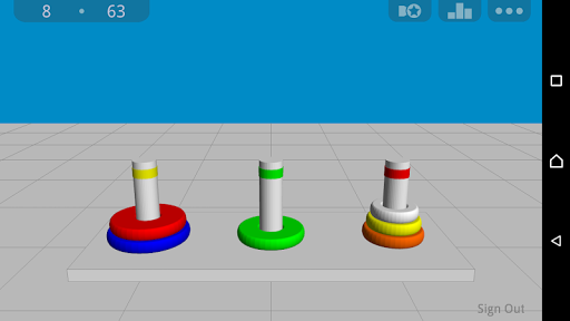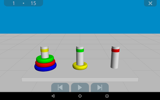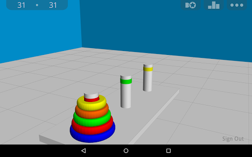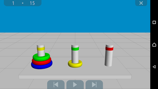A 3D implementation of the classical mathematical puzzle "The Tower of Hanoi". The objective is to move the tower from the first pole to the last, making only one move at a time and without placing a bigger disk on top of a smaller one.
