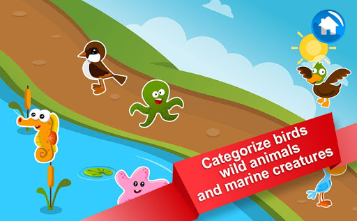 - Marine Creatures: Here kids will learn about different marine animals and will also learn which animal lives in water and which lives on land (creatures like dolphin, whale, orca, seahorse, hippo, starfish, sea shell, jelly fish, octopus, shark and etc.).