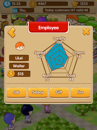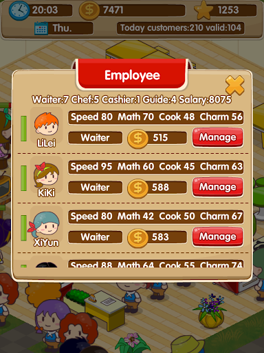 Your employees each have different abilities,speed is for waiter,cook is for chef,charm is for guide,and math is for cashier. 4 occupations carry out their duties,cooperate with each other,serve customers.You just need to hire the right people to do the right job.