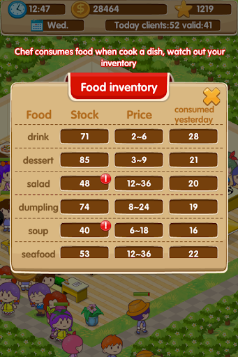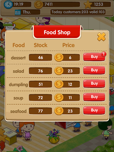 Food is not produced by magic.You have to watch the inventory and check the food shop’s price which changes everyday. Purchase the resource you need: rice,noodle,vegetable,meat,seafood,soup,dumpling,salad,dessert,drink.