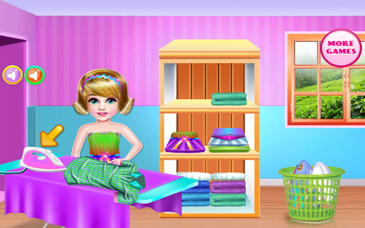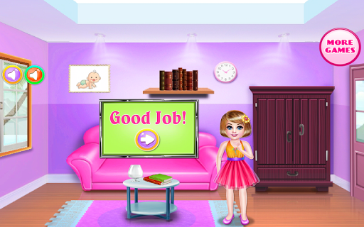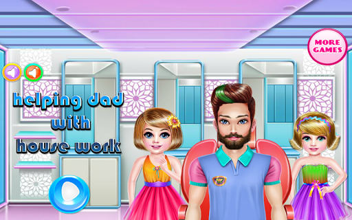 Your dad needs your help now ! help him before he loses his mind and go crazy because of the many chores. help your daddy accomplish many tasks in this free to play cleaning games . First, your mission will be to take care of the living room that is a total mess. a lot of things need to be taken care of , but we will only focus on the most important things which is : get rid of the garbage first , collect it and place it in the trash can, then wash the carpet and make sure you don’t see any footprints over there, also wash the floor and then to wipe it clean, erase the spider’s web and the nasty dust, don't forget about the closet too . Also we have a lot of things that are not exactly in their right place, make sure each one of them is put back in its place. When you are done you have to take care of the dirty clothes , don't worry it's going to be easy because the girls are helping their daddy . then put the laundry in the machine and get it on so you could make them smell and spotless. Once the program of the machine is done move to the part where you are hanging them to dry. Place them back in the closet, but only after you iron and fold them. Now comes the hair styling part where you will choose a type you like and try to implement it for this crazy daddy. first cut the hair, wash it and if it is necessary paint it with crazy colors. Get a nice look for this dad and accomplish the tasks that are assigned to you in this free play game.