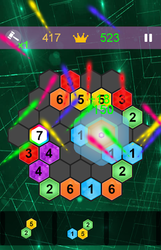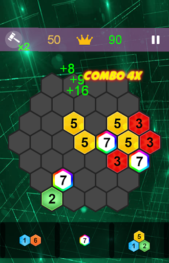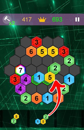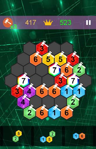 - Place 3 hexa block with the same color next to each other to merge them and get higher number hexa block.