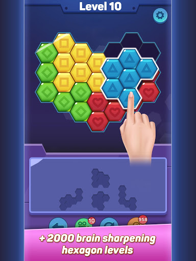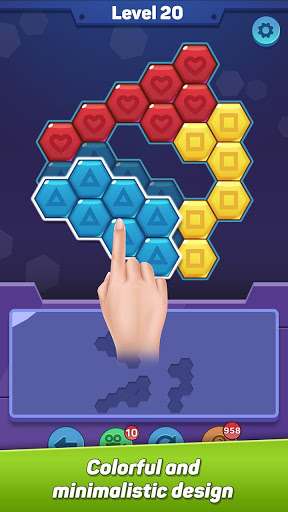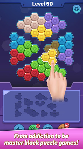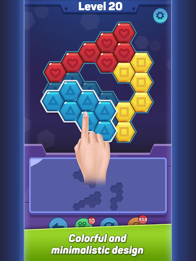 colorful hexagon block puzzle pieces from below onto the board. Each block that fills the gaps, you won the game – but so will the challenges!