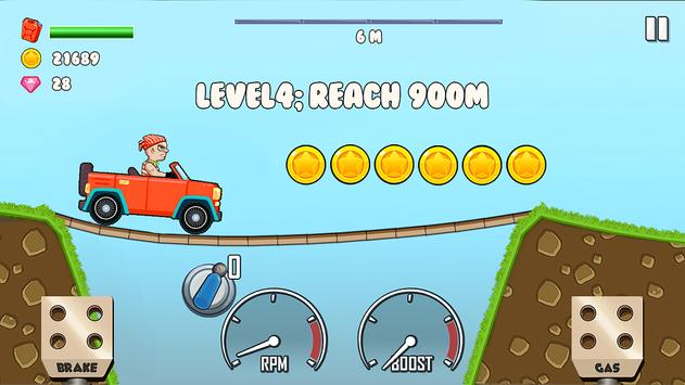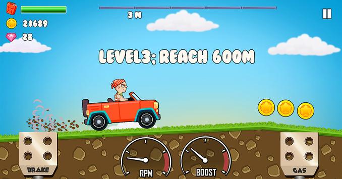 Control your car to climb hills by touch the pedal.Don't letting your car roll back or running out of gas!Collect coins to upgrade your vehicles or unlock new cars and maps,If you complete the first map then you will unlock the next map!