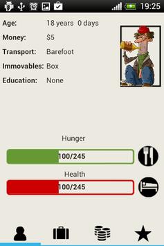 This game is a simulator of a life of homeless man.our task is to maintain and improve his life, moving up the career ladder, or become criminal. Good luck!