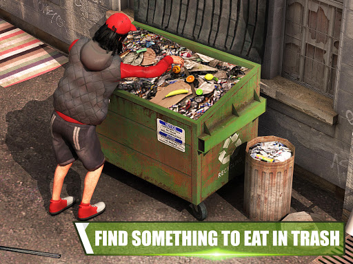 Using all your survival skills will stay you alive, avoid fighting against shopkeepers and search the beverages and drinks that would help you to improve your energy level. Use touch joystick to control your hobo john character, walk around the city, dig through garbage, food, drinks, cutting blades and build shelters. Meet homeless dogs, cats and others tramps, search or dig through garbage to find food & metal fence to build shelters and try to succeed in such a severe city condition.