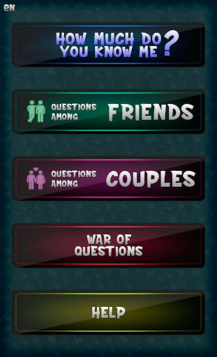 This game calculates how much you and your friend or couple know each other after answering a series of questions. First you have to answer personal questions that will be different depending on who you're playing with. Then you must let the other person with whom you play answer the same questions, trying to get their answers match yours. At the end of the game you will get a total score set by the number of coincidences in your responses. Also, the application will give another score about the relationship between the two of you.