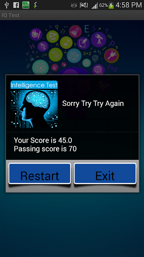 Intelligence test is a multiple level time constrained quiz application for nearly all age groups kids,Teen-age ,middle age and old age people.