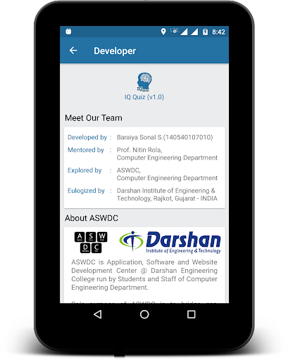This App is developed at ASWDC by Sonal Baraiya (140540107010), a 7th Sem CE Student. ASWDC is Apps, Software, and Website Development Center @ Darshan University, Rajkot run by students & staff of Computer Science and Engineering Department.