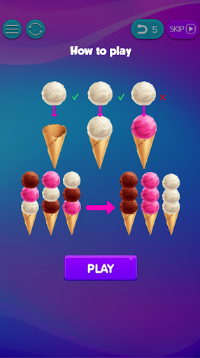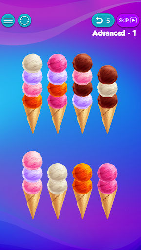 Sort the ice cream colors all onto one ice cream cone. The customers hate colors that aren't all matching, so you must solve the puzzles by taking the ice cream off of one color and placing it onto a matching color. You must do this until there are just ice cream cones with all matching colors.