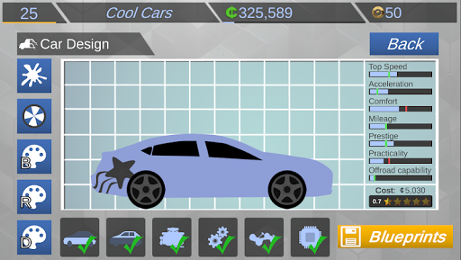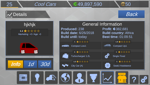 There's a great variety of car types from hatchbacks over SUVs to elegant sportscars and lots of rims, decals and colors to chose from. Keep track of your achievements with a wide array of statistics and graphs showing your company's progress.