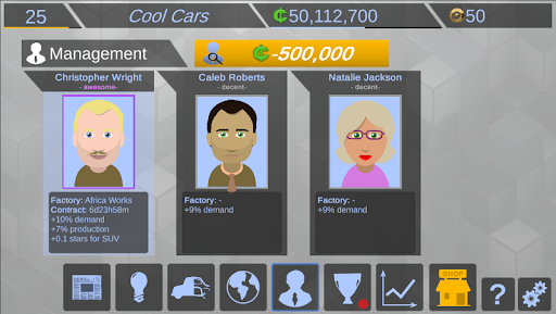 Idle Car Empire is a business simulator where you manage an international car company and become a wealthy tycoon. You design automobiles, research parts and build up your factories all over the world. You take care of the upper management, define prices and sell cars for a fortune. Make smart decisions and then just idle and wait for the money to pour in when you are away.