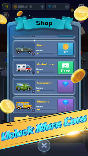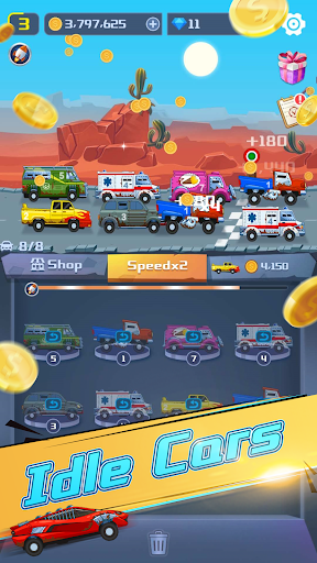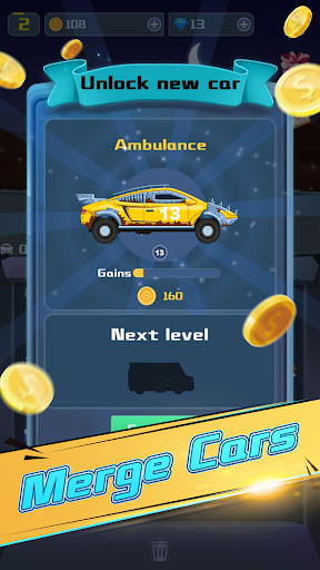 Merge and upgrade your cars, and build a strongest car team to earn coins.