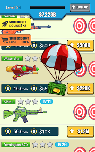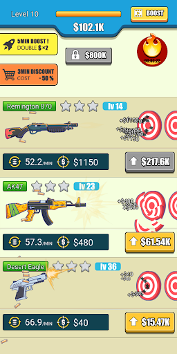 The first step is very simple.Click to earn your first bucket of gold “$5” by shooting the targets.When you accumulate enough money, you can upgrade your weapon. There are so many weapons waiting for you to unlock and enjoy the fun of destroying the targets.