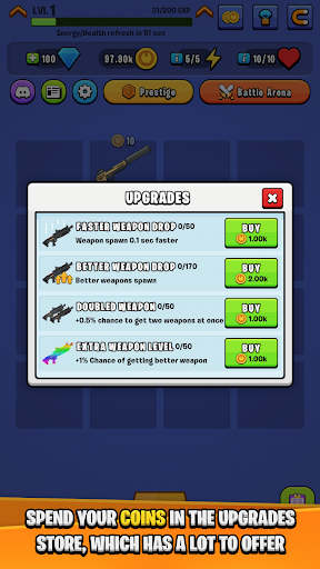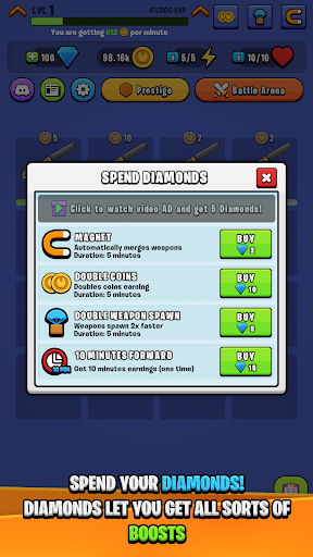 Idle Royale Weapon Merger has very simple and easy functionality, you get weapons every few seconds and when the same weapon appears you can merge them and get better weapon! Better weapons are stronger and generate more coins!
