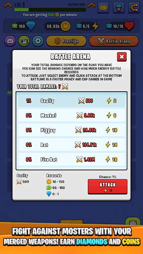 Fight versus monsters with your merged weapons! and be the strongest in the idle royale universe!