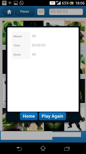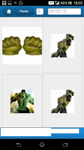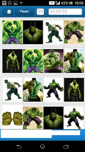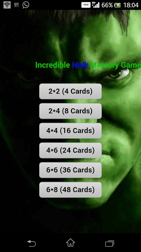 Incredible Hulk Memory Game uses images from the popular movie series; The Incredible Hulk to test and challenge the cognitive abilities of your brain. Moves are recorded, and are used to calculate the score. This score is measured up against our Cognitive Brain Index (CBI) to give a clearer picture of your memory. Choose the game type from the home screen (2*2, 4*4 etc) and enjoy! How to Play: -You will be shown some cards with their images obscured by the default image. -Select a card by tapping on it. -Select another random card. If they match then they remain visible else, they are obscured again by the default image. -If both cards are the same, those cards will remain visible. If they are different, remember what is on the card so you can try again. -The game is over when you have matched all of the pairs and all the cards are gone.