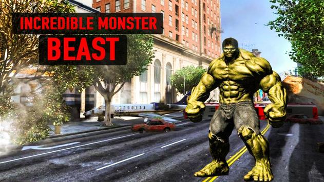 Incredible Monster Beast: Grand City Adventure monster hero fighting game which has a completely organized action packed criminal police attack. Be careful while breaking out of the prison as all security guards are equipped with latest machine guns. Be the rage monster warrior you always wanted to be by playing this amazing package Incredible Hunk and Monster Beast to enjoy incredible action games.fight the cops as possible and smash them all with your ultimate smash powers and kill them all.Jump as much high as you and run fast as you can. Smash all the cars in front of you and smash the building and the entire city.