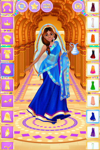 Design a unique outfit or a dancing costume for each of the girl princesses from over 200 items, accessories and hairstyles. Among them sari (saree), petticoats, and choli (ravike) blouses.