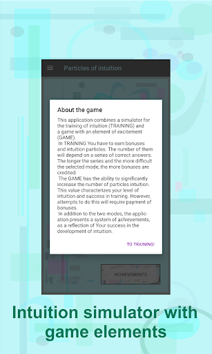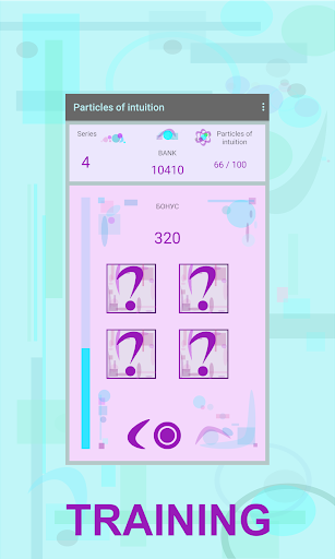 The App "Particles of intuition "is my second app from the cycle "Intuition training". I myself spend 90% of my time in training mode with two possible answers. Other training modes, like the game itself, are designed to add variety. Make the process of training intuition less monotonous.