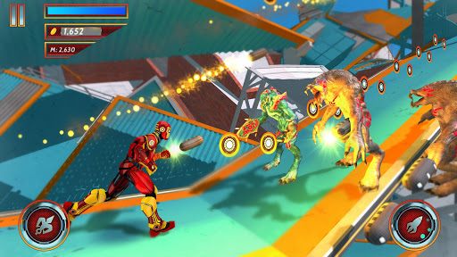 Disguise yourself with the iron suit, embrace your super heroic nature and fight against the mutant infestation. Prove your running and combat skills in this new exciting running game. Jump from one building to another at supersonic speed while collecting coins and destroying with rockets the mutants emerged form a parallel dimension. Find the source of infestation and close the portal to save the day and also the entire planet.