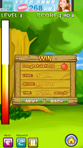 1,select the same fruit, if the connection between the two fruits is less than or equal to the 3 lines (2 turns), you can eliminate a pair of patterns;
