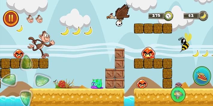 Jungle Monkey Run - World Adventure is a classic adventure game, it's a new world and a new featrues and monsters and so on. So The jungle monkey has come to this beautiful jungle this time, what will be the new challenge waiting for it? Our little monkey runs and escapes from the big monster to reach its parents in the jungle. Just click the screen to make our little monkey to jump all obstacles and smash all the monsters like The ferocious sharks and crabs, the octopus lurking in the water, the sudden attack of the flying bird and run to its parents in jungle. The jungle is so danger. Please help the monkey running out of the jungle and collect more coins.