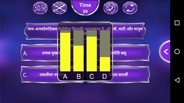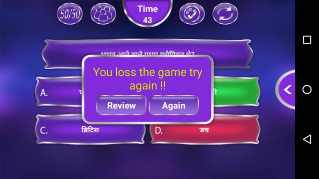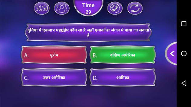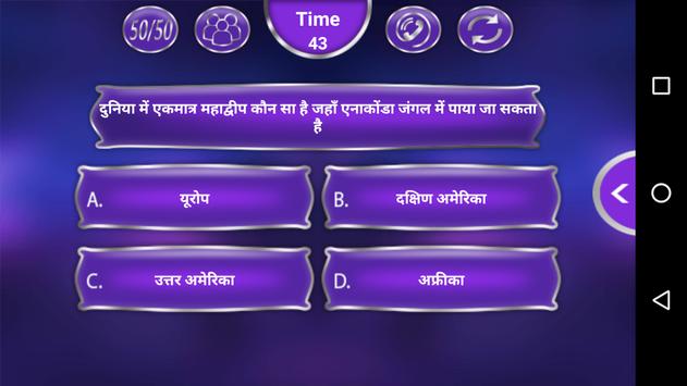 This game is made on the concept of famous Game show Kaun banega crorepati. Get real environment to prepare for KBC 2017.Play KBC GAME Android App and improve your knowledge and enhance the GK quiz and chance to select in KBC.We are presenting you the famous KBC game which is based on KBC game show which is popularly known as kaun banega crorepati. This show also used to telecast in different languages like KBC in gujarati, KBC game in hindi, KBC game in Marathi, KBC game in tamil popularly known as Neengalum Vellalam Oru Kodi and KBC in malayalam known as Malayalam Kodeeswaran game, and also telugu Meelo Evaru Koteeswarudu, (English: Who among you is a Millionaire). Originally inspired from who wants to become millionaire. This game is for the people who love challenges in life and also suitable to improve knowledge for kids and family, so we can say it is best game for kids. We are covering trending topics like bollywood quiz hollywood quiz, cricket quiz, filmy quiz, quiz based on indian history, general knowledge, maths, biology, english, hindi, gujarati grammar, intellectual questions for intelligent people. - Around 10000 questions.- 4 Life line.- Play this game and prepare yourself for KBC 9- increase GK knowledge and current affairs- its best app in india and US - know the history of india and culture- Quiz up the knowledge - prepare for competitive exam, UPSC, bank po, ssc and government jobs for india