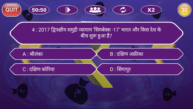 > Game will be covering various topics like GK (General knowledge), Indian History Quiz, Cricket Quiz, Bollywood quiz, film quiz, History quiz, International quiz and questions from almost all the topics like Social Science, Science, Mahabharata, Ramayan, Quran, Bible, spiritual questions and difficult questions too.