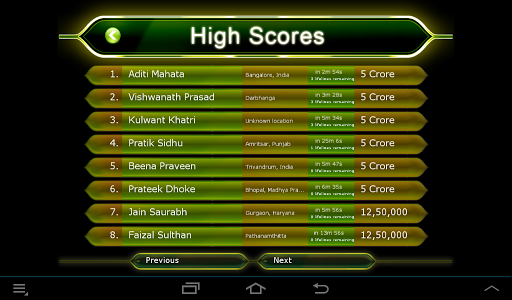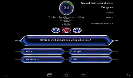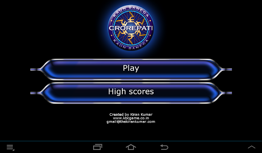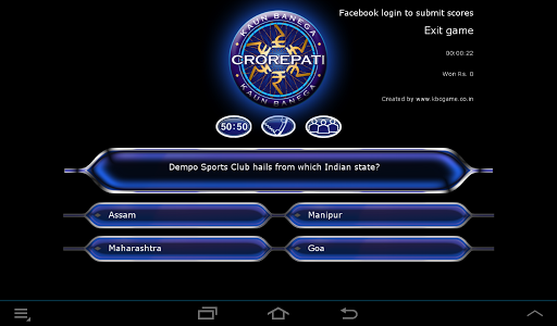 This is a simulation of the popular Indian TV game show "Kaun Banega Crorepati" hosted by Amitabh Bhacchan. This game includes real audio clips and graphics from the tv show and mimics the TV show very closely.How to play ?When you open the game, you will be taken to the first question directly. There is no concept of fastest finger first in the game right now. This first question if answered correctly, will fetch you 5000 Rs. Answering a question is through one of the four given choices. As the game progresses, with every question, the money that you won will double. Any any point, if you think that you do not know the game, you can use one of the 3 given lifelines. Every lifeline can only be used once throughout the game. The first lifeline is fifty fifty. This lifeline will remove 2 wrong choices and you have to pick the right answer from the remaining 2 choices. You can also use phone a friend lifeline. This lifeline will simulate a conversation with your friend. As per the logic of the game phone a friend will mostly give the right answer. You might also run out of the 30 second time limit for phone a friend. The third lifeline is audience poll lifeline. This will simulate a poll amongst the audience attending KBC and will show you the results of the poll in the form of a bar graph.At any point of time, if you answer the question wrongly, you may either lose all your money all get the minimum money allocated for that level. 3,20,000 Rs for example is one such level. If you answer a question wrongly after winning, 3,20,000 Rs., you will take home that money and wont lose all the money.The game will submit your highscore to the server if you have logged in via facebook by clicking the "Login with facebook" link in the top right corner of the game. These highscores are viewable from within the game as well as the website kbcgame.co.in