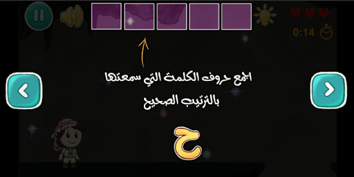 A letter a step (Khutwa wa Harf) is a side scroller Spelling Game suitable for ages 8 years and older. The player goes on an adventure and gathers the letters of the pronounced word in the correct order, according to the Arabic spelling rules shown in the game.