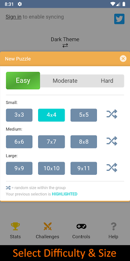 ● puzzle sizes: 3x3, 4x4, 5x5, 6x6, 7x7, 8x8, 9x9, 10x10, 9x11