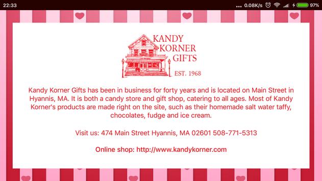 Kandy Korner Gifts has been in business for forty years and is located on Main Street in Hyannis, MA. It is both a candy store and gift shop, catering to all ages. Most of Kandy Korner's products are made right on the site, such as their homemade salt water taffy, chocolates, fudge and ice cream.