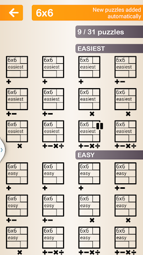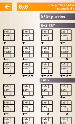 There are virtually unlimited KenKen puzzles available to you on this app. The first 50 are included FREE with the download. If you need more...no problem! Just order them and they'll appear immediately. YOU select the size, difficulty level, and operations. After you complete a puzzle, a new puzzle of the same type will automatically load so you can continue to challenge yourself.