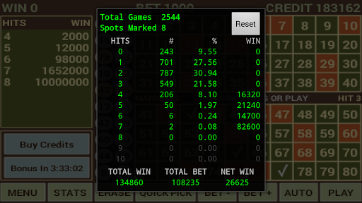 Keno is a simple lottery-like game. To play, decide how much to bet and pick 1 to 10 numbers from field of 80. How much you win depends on how many of your numbers match 20 randomly drawn numbers.