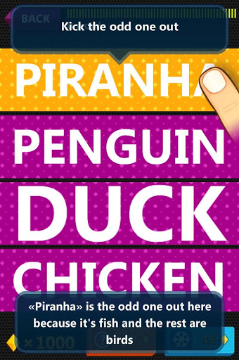 «Kick the word» is a game with words. Goal of the game is to find the word which is the odd one out and kick it. For example, 4 words: «Piranha», «Penguin», «Chicken», «Duck». Guess who is the odd one out. «Piranha» is the odd one out here because it's fish and the rest are birds.