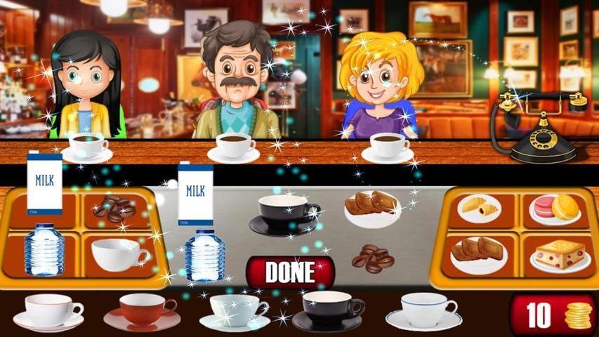 In this game you play as a coffee shop cashier and Coffee Maker Chef. Customer visit and told you his order and you have to make a good blended coffee cup with the help of water, cocoa beans, milk and sugar. You also have multiple type of cakes and biscuit and have to serve to customer on his request. When order is completed collect you coins. One this more, your coffee beans are limited, you have to buy coffee bean by calling to coffee provider. More you play, more you earn. Maintain your cash flows and cash register.