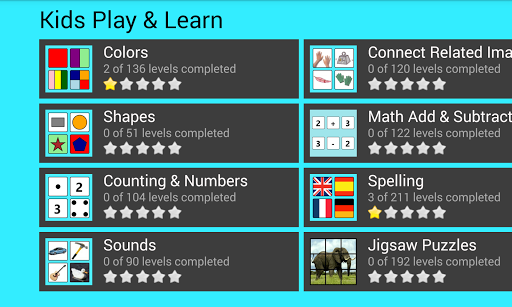 Kids Play & Learn is a fun and colorful educational game for kids in the age 2 to 10. The game teaches your kids about colors, shapes, things that are related and opposites, counting, numbers, sounds, simple math, spelling and to tell the time through different types of puzzle mini games. In addition it teaches concentration through jigsaw puzzles of various difficulties. All in all Kids Play & Learn consists of 12 categories, 92 games and 1305 levels.