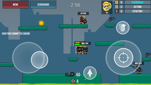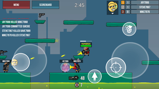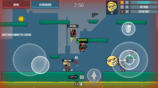 power ups. Players can pick up weapons to eliminate others and health pick ups torefill their hp. Players gain scores by killing other players or by performing multi kills