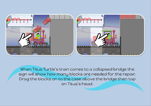 When Titus Turtles train comes to a collapsed bridge the sign will show how many blocks are needed for the repair. Drag the blocks on to the case above the bridge then tap on Titus's head.
