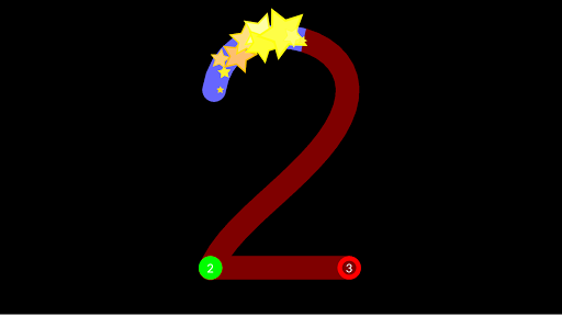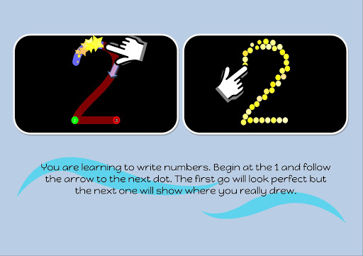 You are learning to write numbers. Begin at the 1 and follow the arrow to the next dot. The first go will look perfect but the next one will show where you really drew.